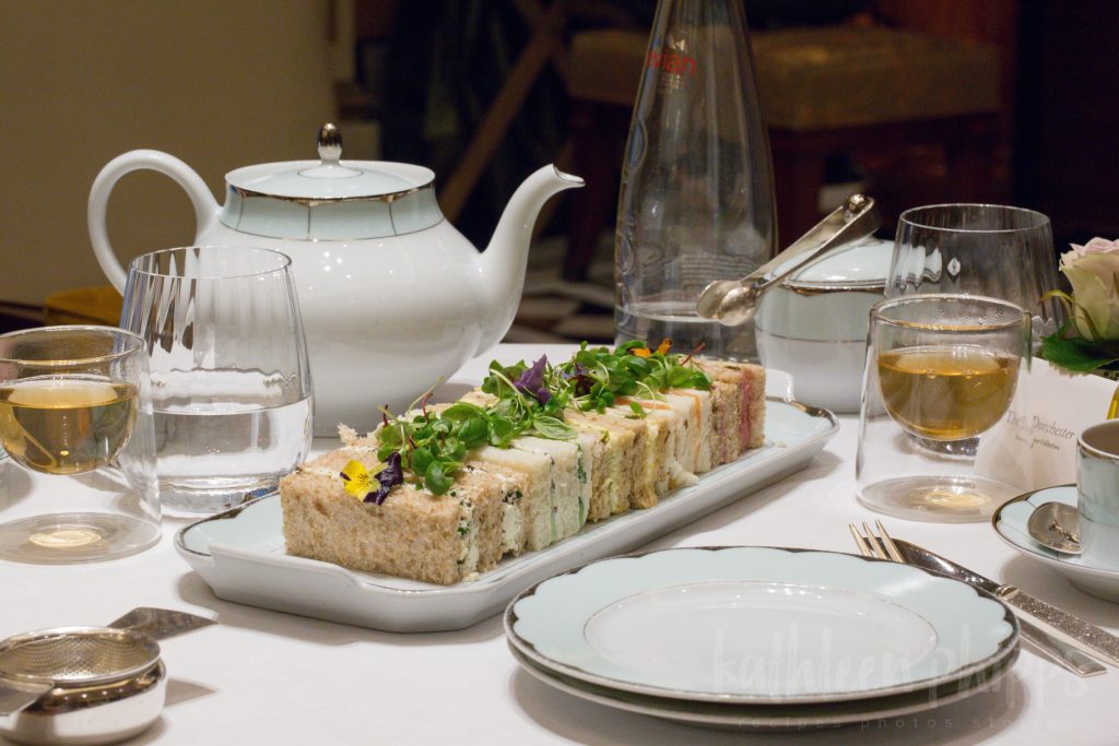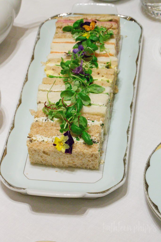 The tea sandwiches were served next, arranged in a neat row on a platter, decorated with edible flowers and baby watercress. They were the most uniform tea sandwiches I’d ever seen, filled with a plethora of uniquely British ingredients.